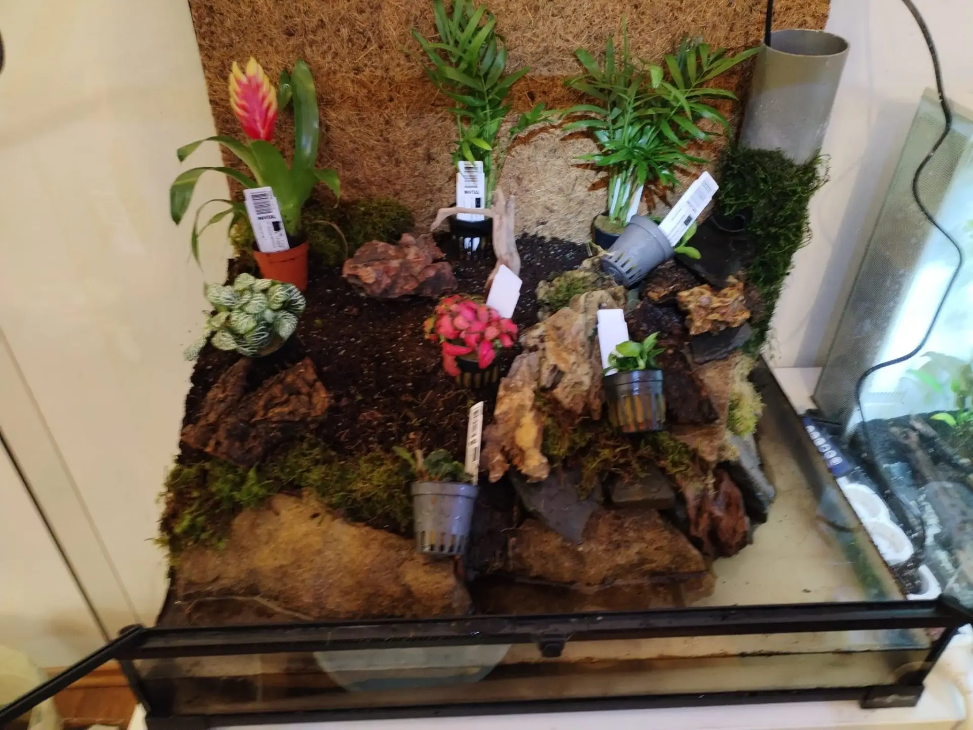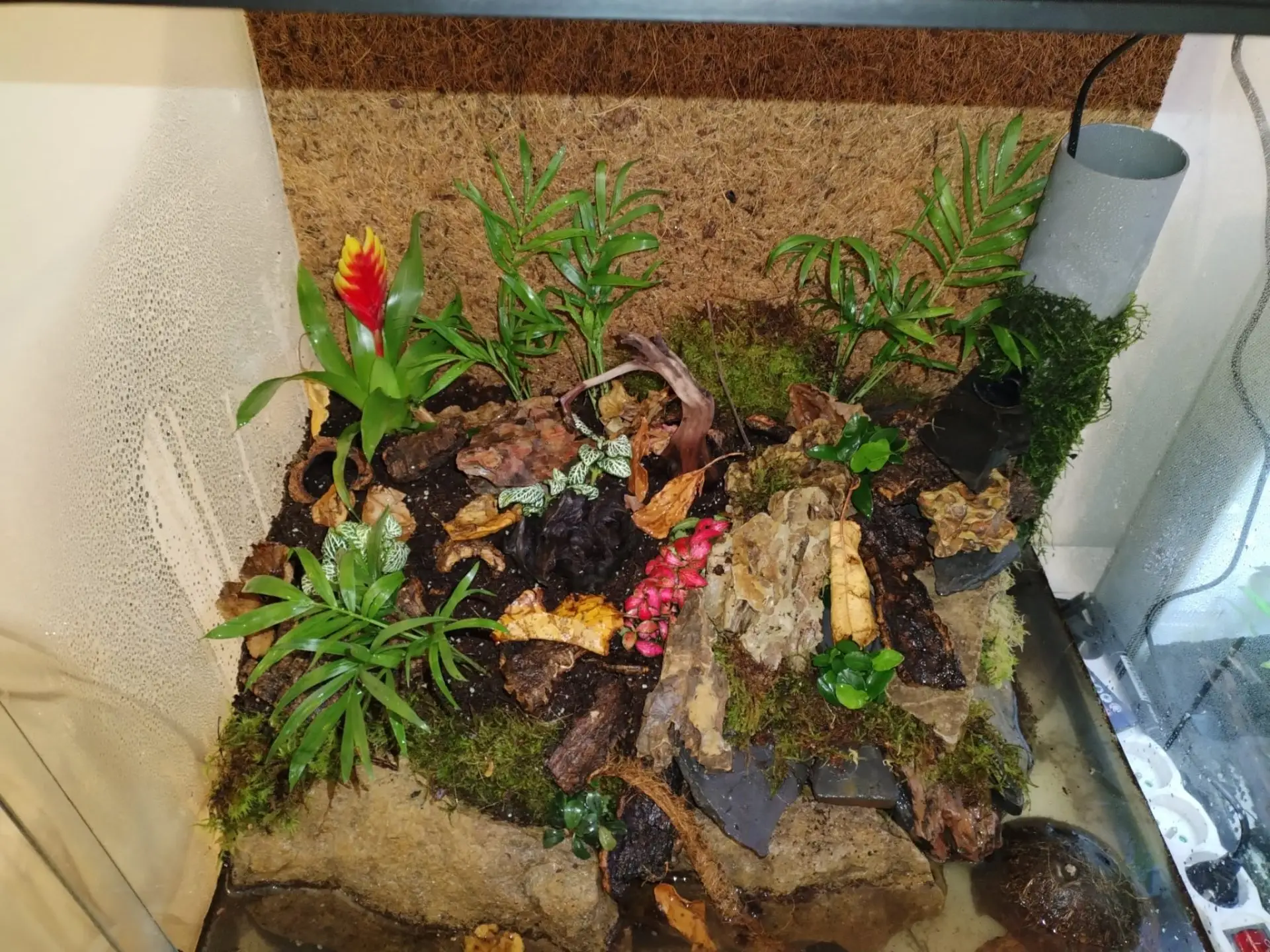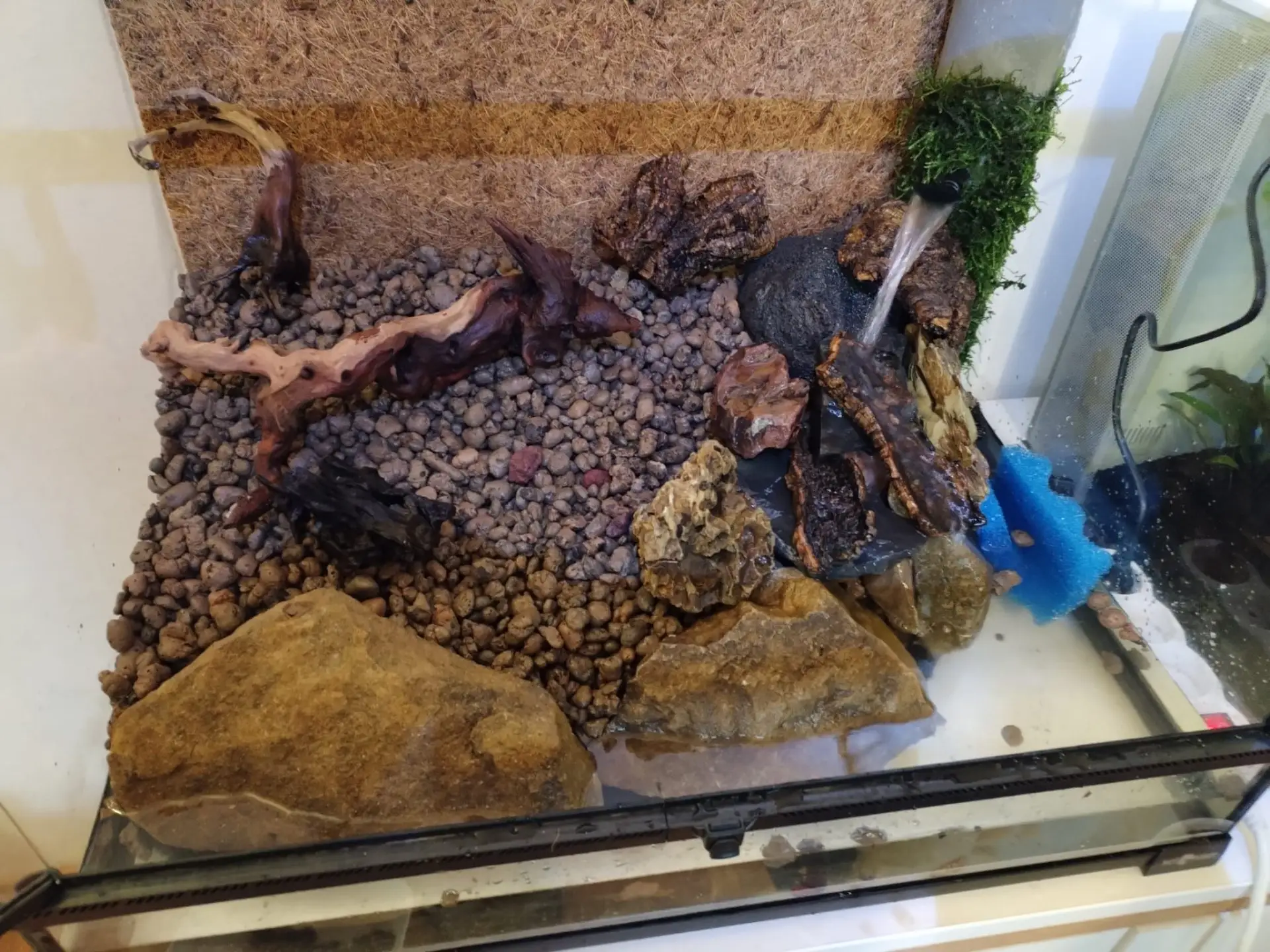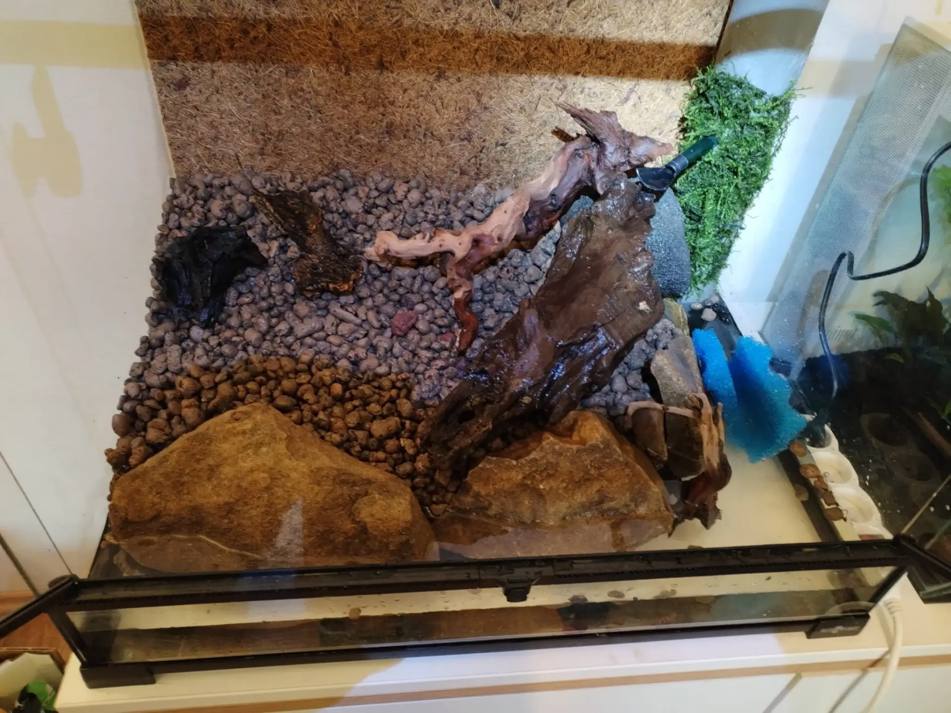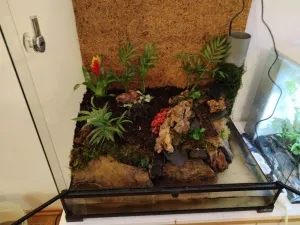 Dekorace: Kameny z přírody + dragon stone a břidlice, dále korková kůra, akva kořeny, listí, akva mechy, spagnum, cholla wood